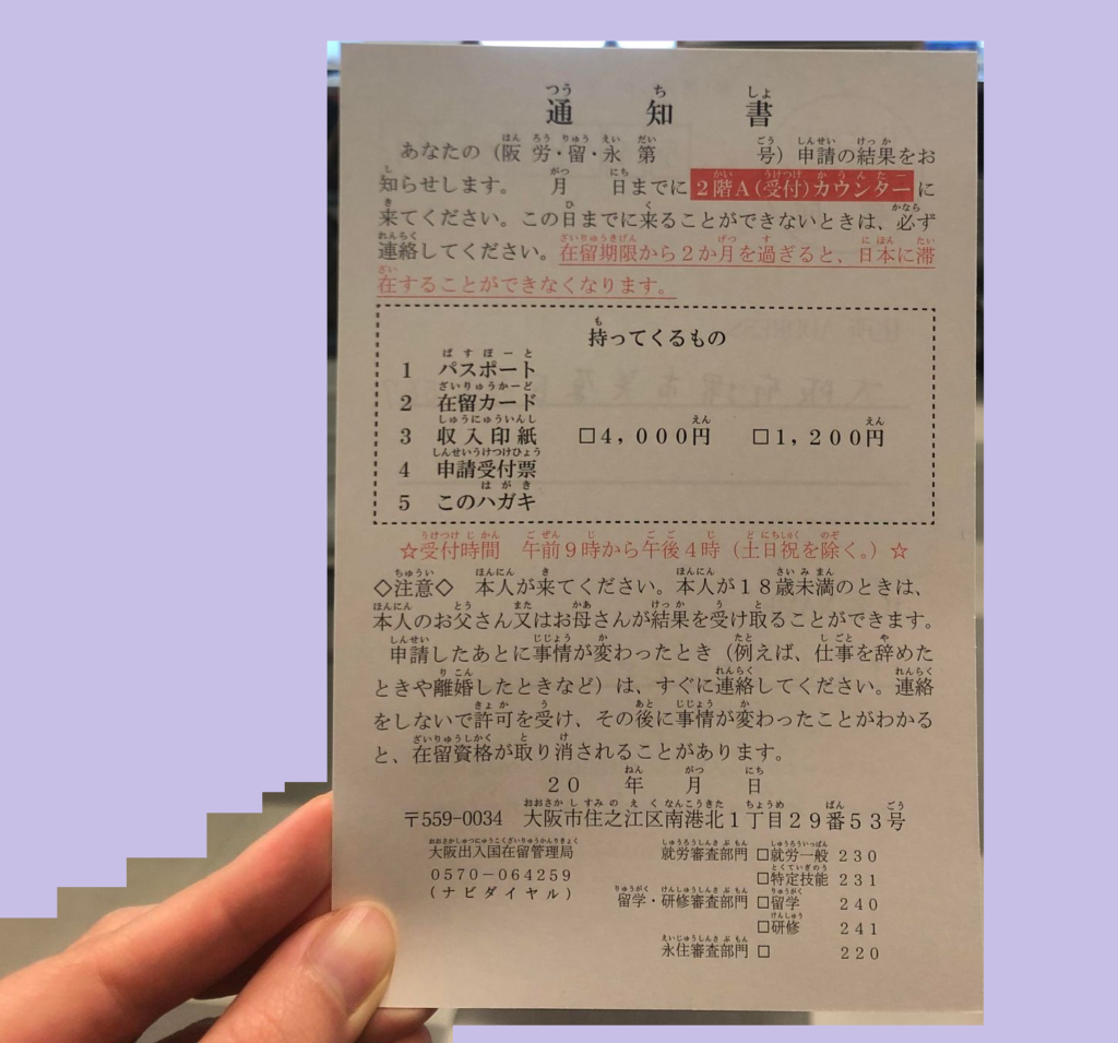 Hôm trước, tôi đã đến Cục Quản lý Xuất nhập cảnh Osaka để làm thủ tục thay đổi tư cách lưu trú.